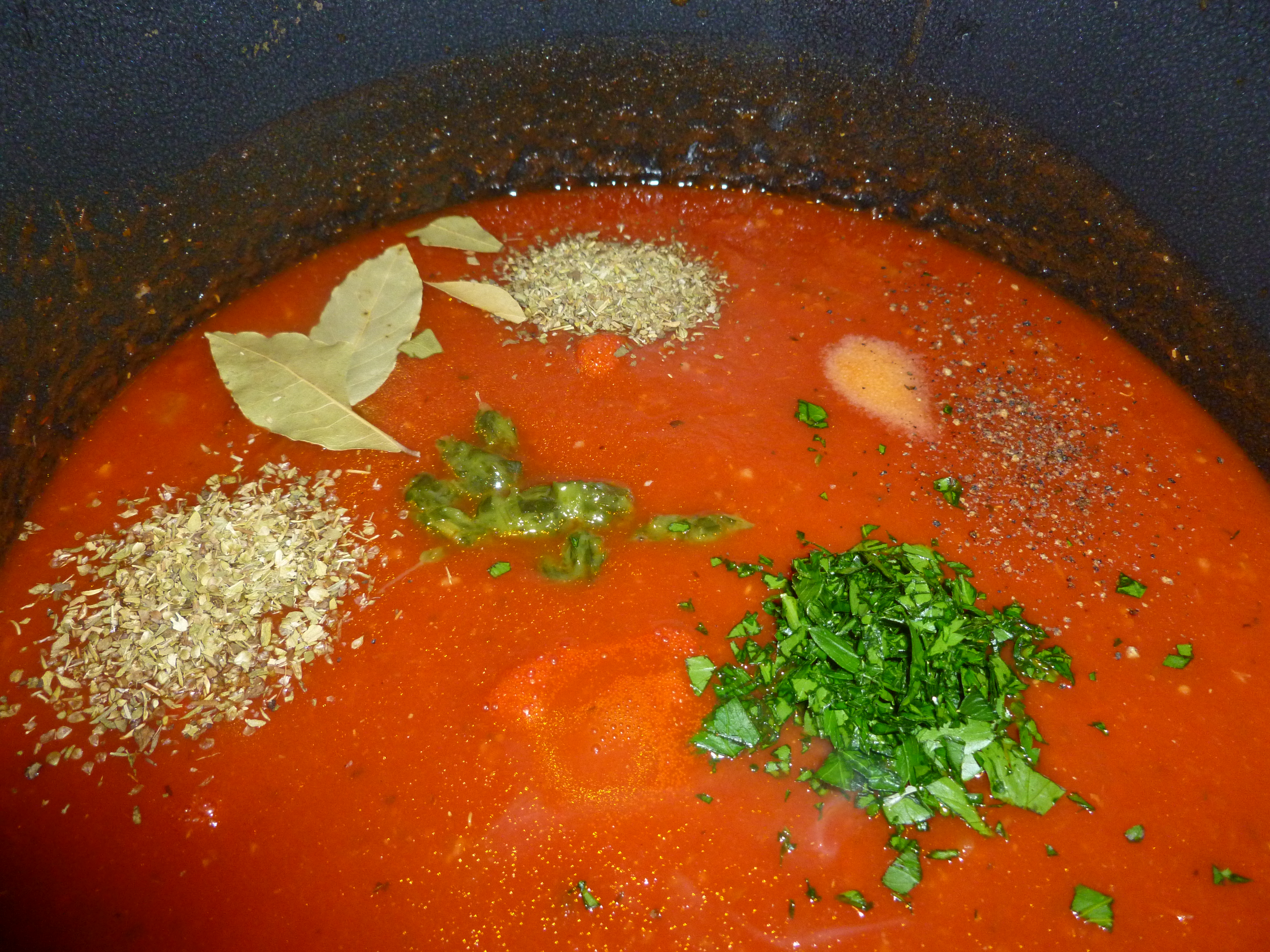 - Basil, bay leaf, oregano, fresh parsley, Italian seasoning, and salt and pepper