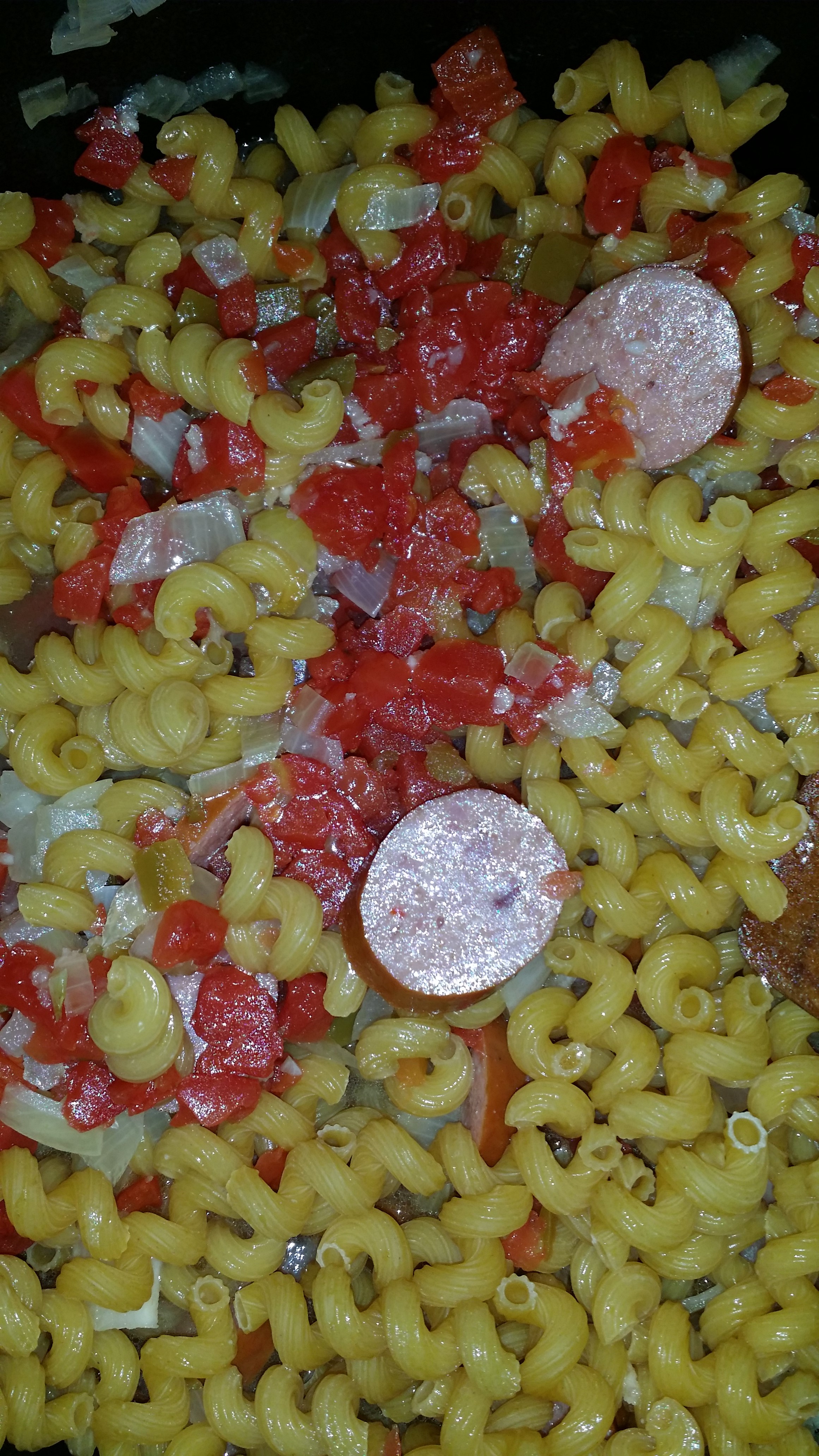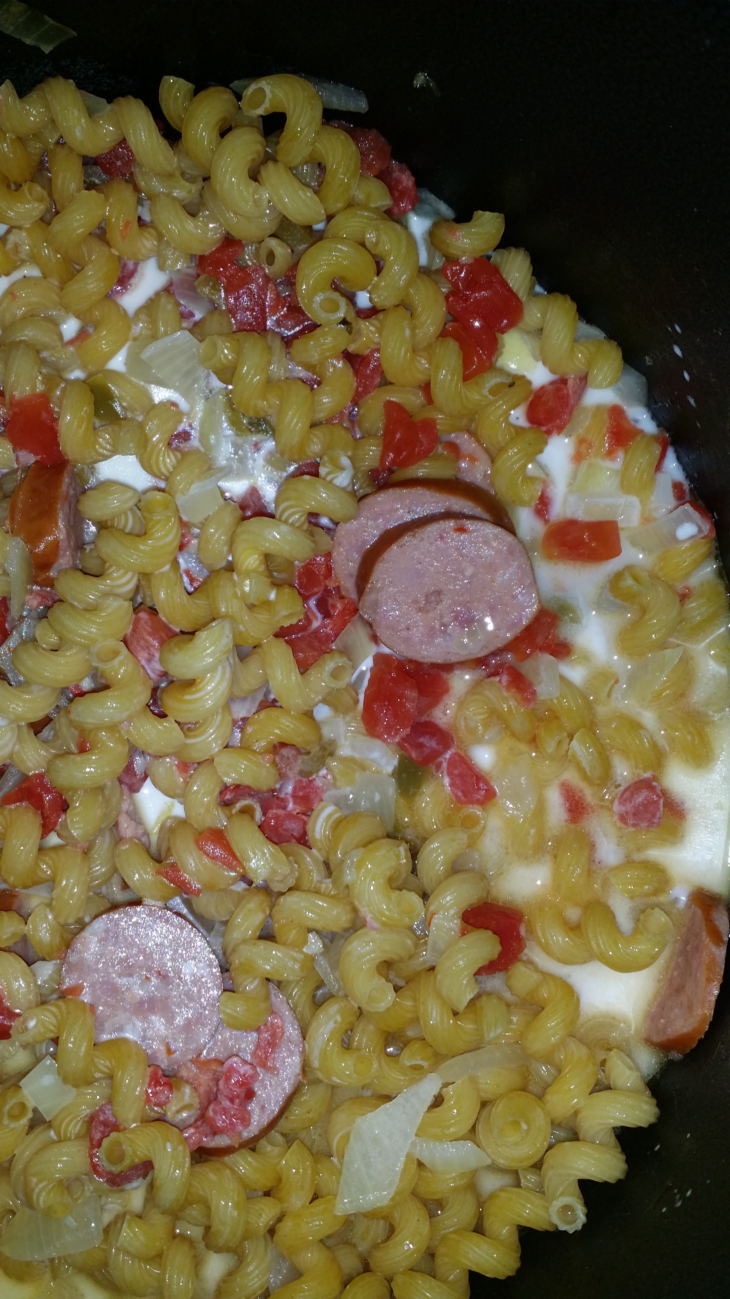 - Add broth, tomatoes, half and half, pasta, salt and pepper and stir. You may want to add a little water or other liquid to so that you can see it level with the pasta.