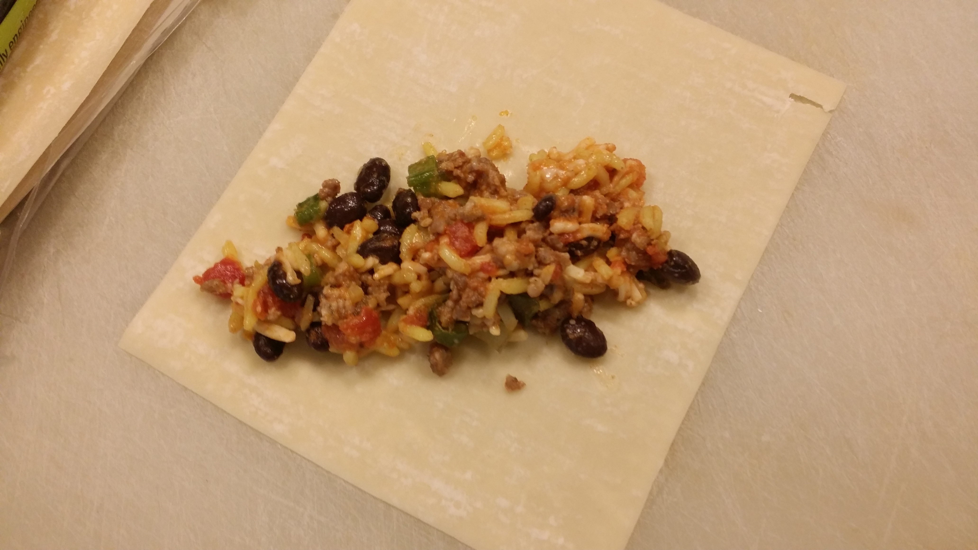 - Spoon about 1/3 cup rice mixture in center of each egg roll wrapper. Fold top corner of wrapper over filling, tucking tip of corner under filling; fold left and right corners over filling. Lightly brush remaining corner with egg; tightly roll filled end toward the remaining corner, and gently press to seal.